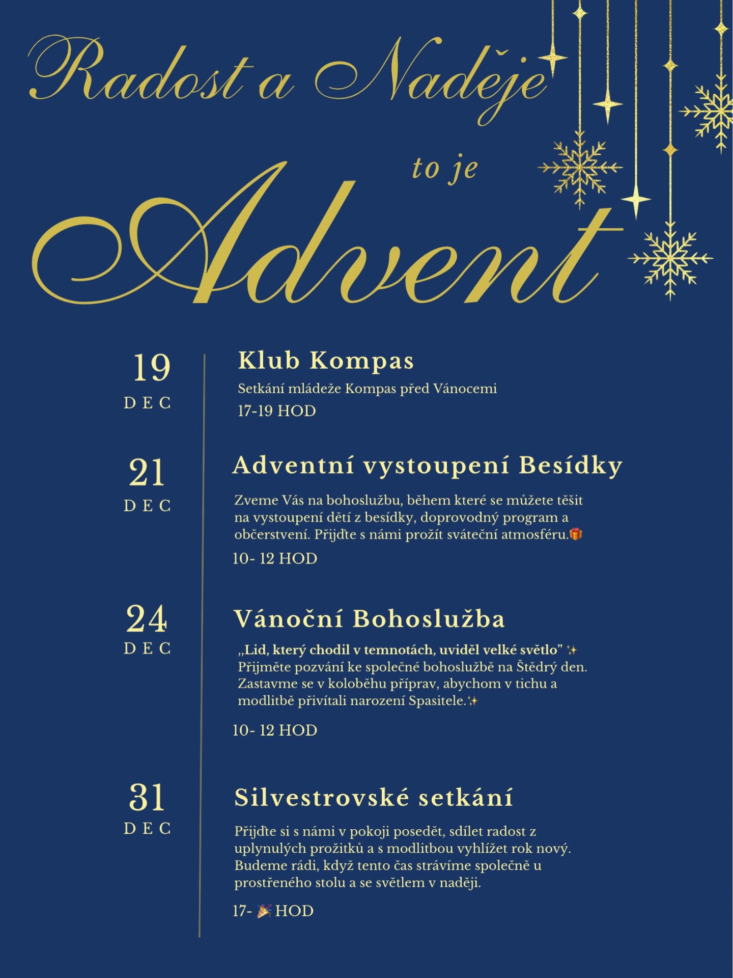 Setkání mládeže, adventní vystoupení, vánoční bohoslužba i silvestrovské setkání ✨