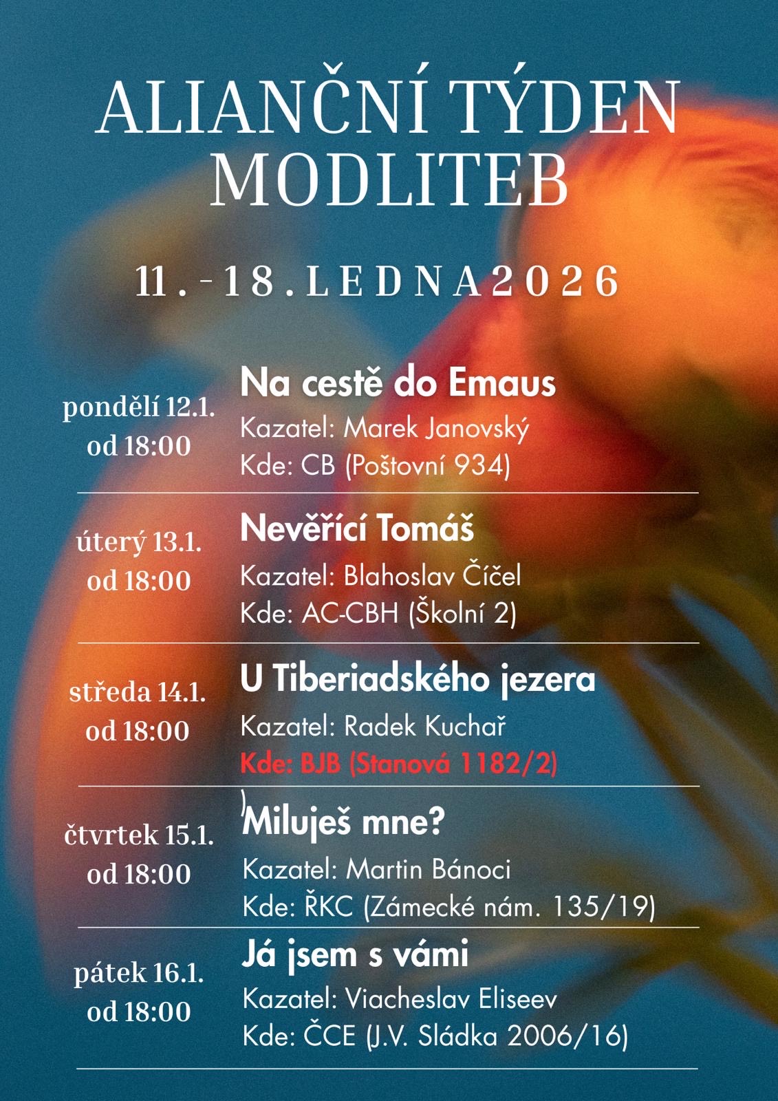 Rok se s rokem sešel a je tu znovu Alianční týden modliteb. Zveme vás na ekumenická setkání a společné modlitby napříč různými církvemi, která nás spojují v jedno. Od 11.-18.ledna 2026 vždy od 18:00 různá místa a různí kazatelé, více info na plakátu.